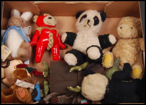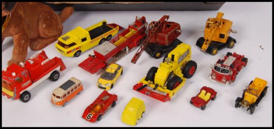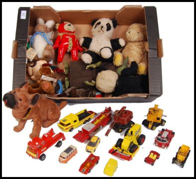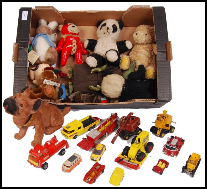 A collection of assorted of vintage 20th century teddy bears to include; Russ made Royal Winterfest Jeepers dog, Gund Classic Pooh, Panda & others. Also included with this lot is a collection of vintage Corgi, Dinky & Matchbox diecast model vehicles to include; K7 Race Cars Transporter, Coles Mobile Crane, Michigan Tractor Dozer, Conveyancer, Aerial Rescue Tractor & others. All loose.