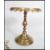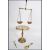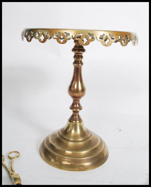 A late 19th century brass tazza / cake stand, raised on a turned base with an ecclesiastical fret pierced top together with a pair of brass balance scales, Art Nouveau brass spoon and a pair of 19th brass candle snuffers.
