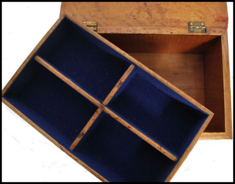 A 19th century Victorian birds eye maple box being cross banded and having ebony inlay. The hinged lid opening to reveal a fitted lift out inner tray. Measures 12 cm high, 28 cm wide and 18 cm deep.