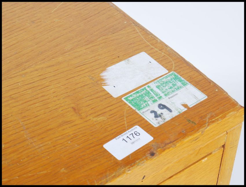A mid century - ex Bristol University oak plan chest of drawers / architects cabinets being raised on squared supports with a bank of 4 deep drawers. Measures 107cms by 123cms by 61cms.