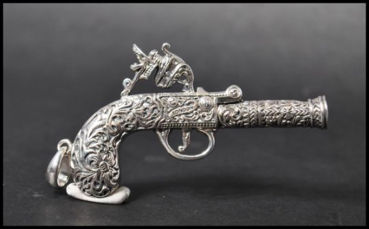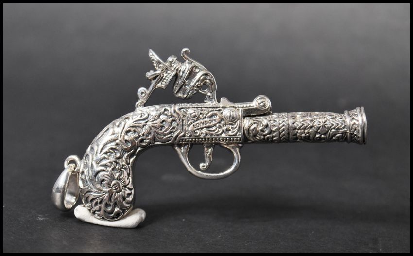 A 925 silver novelty pendant in the form of an ornate pistol with bale. Marked London 1795 Sterling.  Measures 6.5cms. Weight 24.9g.
