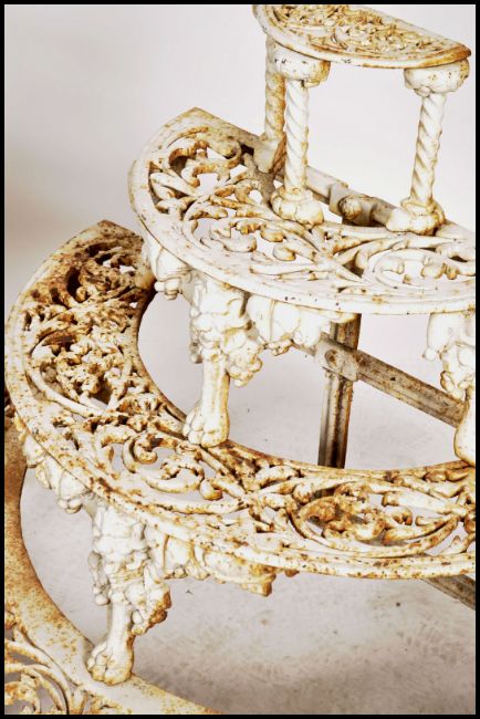 A rare pair of 19th cenury Coalbrookdale manner 4 tiered cast iron lattice and pierced worked plant stands , tree surrounds. Each tier cast in relief with scroll work and raised on cabriole style supports.
