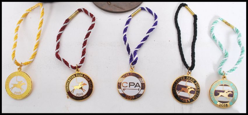 The Pimms book of Polo by John Lloyd together with other polo related items belonging to John Lloyd to include several members badges for Cirencester Polo Club, two pairs of silver white metal cuff links of horses with polo players, a mounted horse shoe from Reg' Ruby first winning race under John Lloyds colours, a bronze medallionof a polo player on horse back by Berthe Martinie etc.