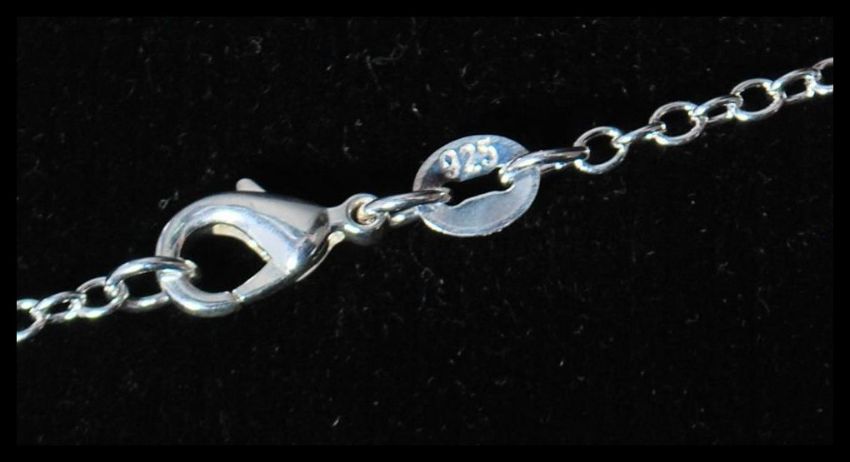 A 925 silver Art Nouveau style pendant necklace strung with an ornate magnifying glass set with emerald green stones strung on a link chain. Measures approx:- Chain 18 inches; Pendant 6.5cms.