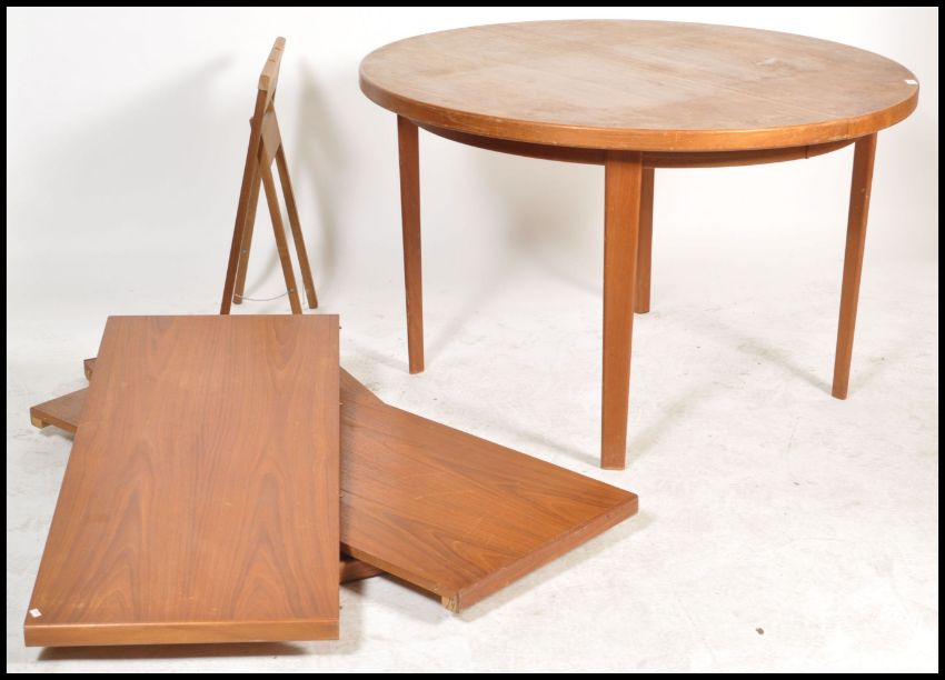 A 1970's retro teak wood circular dining table being raised on square legs. The extending table top with leaf to underside