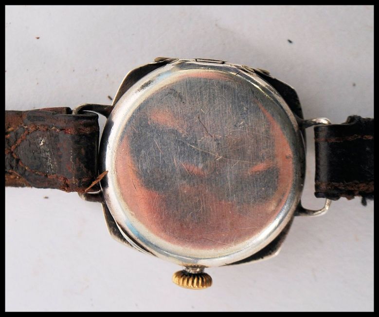 A vintage early 20th century Rolex 1917 trench military interest watch having a silvered dial Arabic numerals, faceted hands and a subsidiary seconds dial. case opens to reveal a Rolex stamped 15 jewel wristwatch  with London silver 925 import marks date letter b for 1917 and makers W&D. Ser No 824736 n. Set to a vintage leather strap.