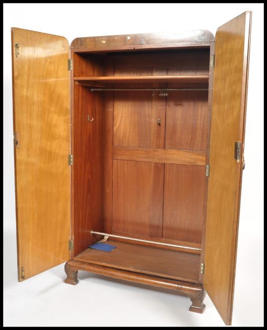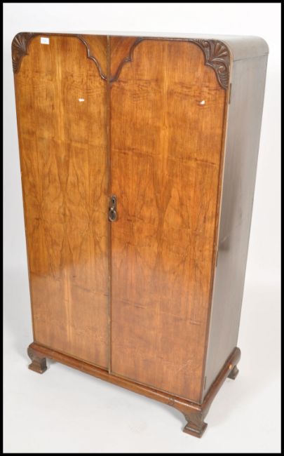 A 1930's Art Deco walnut bachelors wardrobe being raised on shaped leg plinth base with double doors enclosing storage set within. Measures 158cm x 99cm x 51.