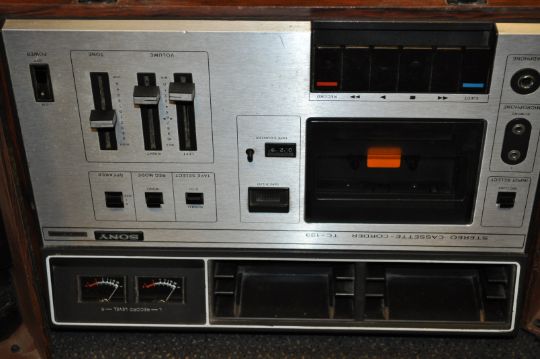 A vintage Sony TC-133 speaker cassette recorder set having built in speakers for ease of movement.