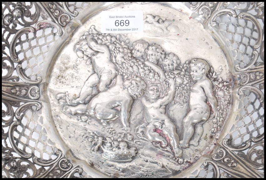 A large 19th century German silver centrepiece bowl having a pierced serpentine edge with scrolls and swags. The central medallion depicting cherub putties with fruit. Weighs over 500 grams. Stamped 800.