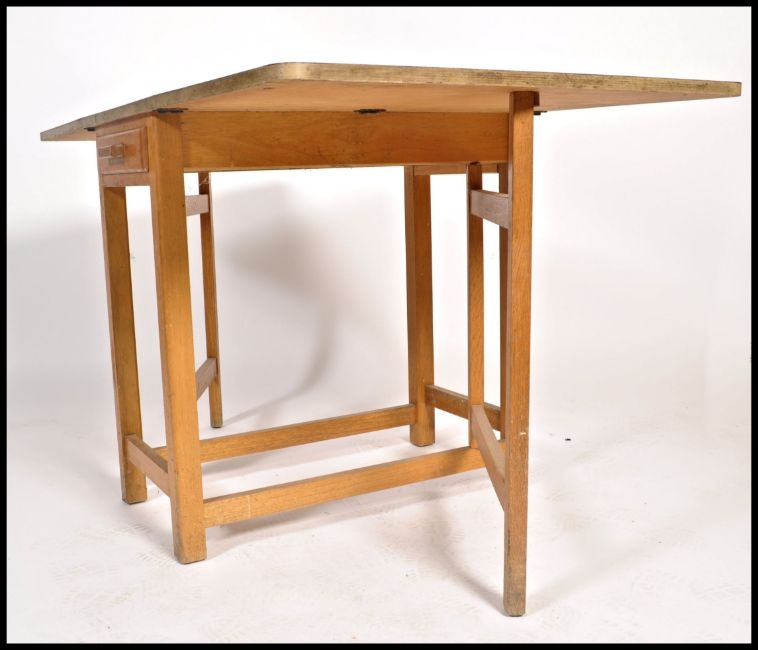 A retro 1950's red formica and beech wood drop leaf harvest table. The red formica top raised on gate leg action with cutlery drawer to one end. Measures 77cm x 76cm.