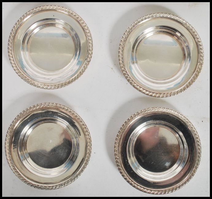 An early 20th century continental silver plated pierced and cast rococo soap dish, the centre with winged cherub putti playing flute. Together with a pierced silver plated tea strainer of rococo form and a set of 4 silver plated coasters. Measures 8.5cm in diameter.