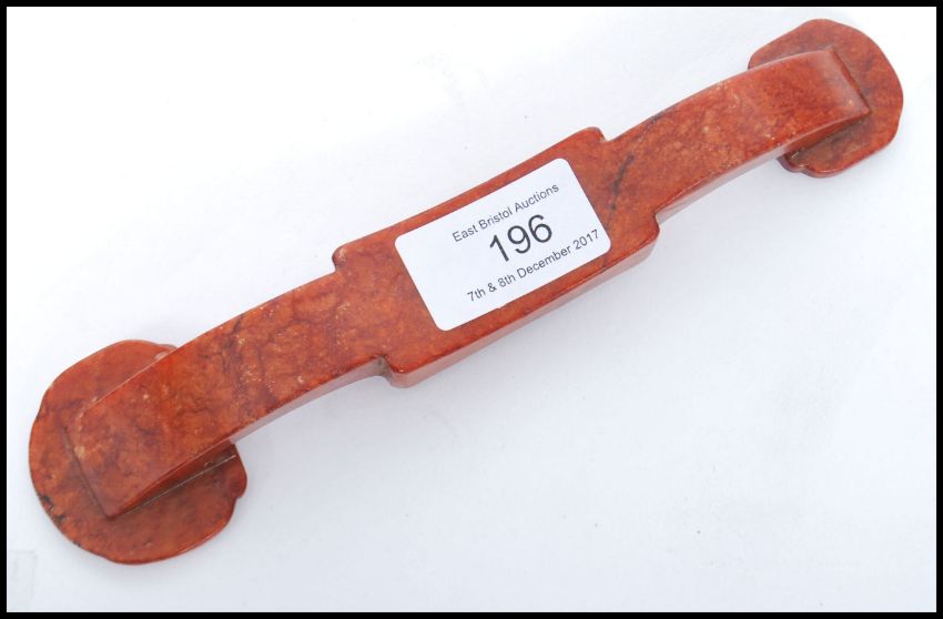 An Oriental Chinese soapstone carved ruyi sceptre. Carved in relief with shou characters and archaist dragon heads. Measures 19cm high.