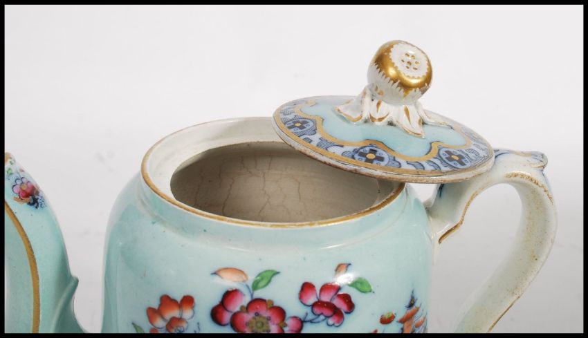 A late 19th early 20th century Staffordshire china teapot, transfer printed with scenes of scholars and birds of paradise. Measures 21cm high.