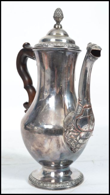 An 18th century George III silver plated coffee pot in the manner of Hester Bateman. Baluster form on circular foot with beaded borders, the domed cover with foliate finial atop.