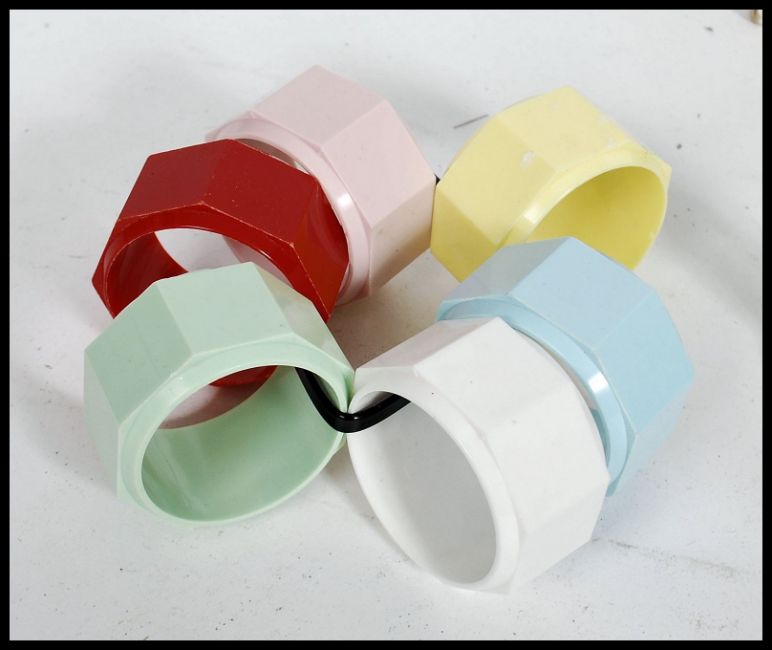 A collection of vintage / retro kitsch to include a set of six multi coloured napkin rings, a set of ten miniature  bonsai tree style name / place settings and a set of six mid 20th century coloured shot glasses.