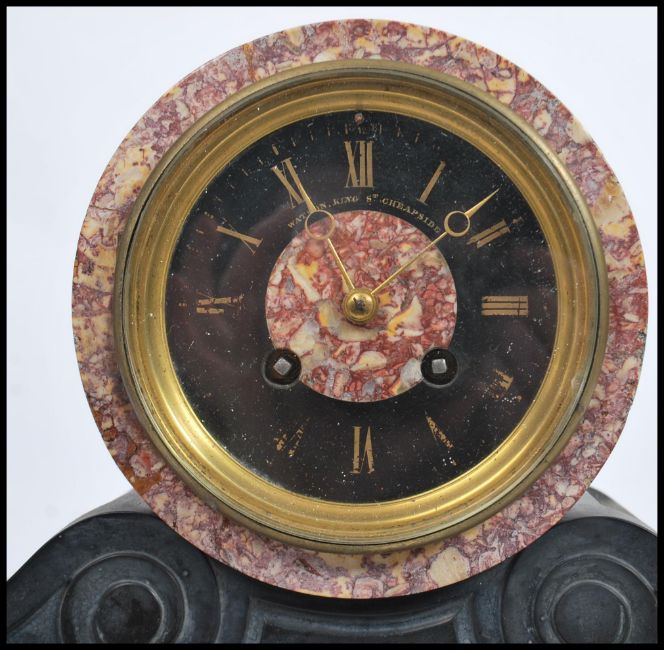 A 19th century French rouge marble barrel clock by Jean-Baptiste Delettrez. The 8 day movement marked for JBD to rear, black face in cylinder top on plinth base. Measures 24cm x 34.5cm.