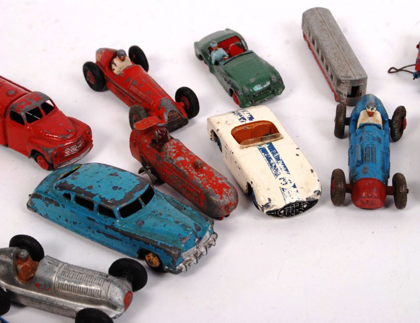 A good collection of vintage Dinky diecast model cars and vehicles. Comprising of; 230 Talbot Lago, 133 Cunningham, 23F Alfa Romeo, 107 Sunbeam Alpine, Hudson Sedan, Mercedez, Tanker (red), 111 Triumph TR2, 190 Caravan,  232 Alfa Romeo, 60Y Shell Aviation Service, 23N Maserati, 156 Rover 75, 110 Aston Martin (x2 green and red), 23J HWM, 23H Ferrari and others. Condition various (mostly poor to fair). Some rare. An interesting collection.
