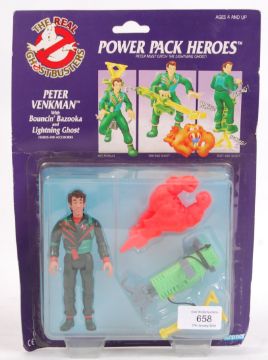 An original vintage retro 1980's Kenner The Real Ghostbusters carded action figure ' Peter Venkman with Bouncin' Bazooka and Lightning Ghost ,' from the Power Pack Heroes series. Carded, unused, on original card back.