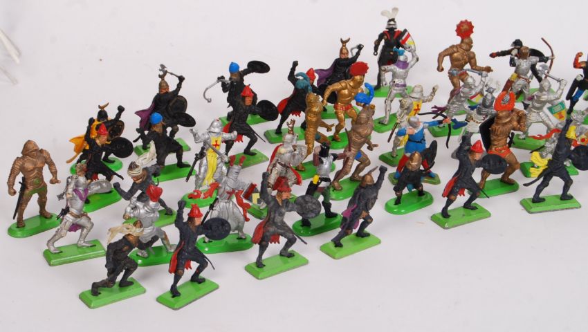 A large collection of assorted vintage Britains Deetail Knights / Medieval characters. Plastic model figures on diecast metal green bases. Various poses and variations.