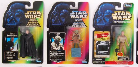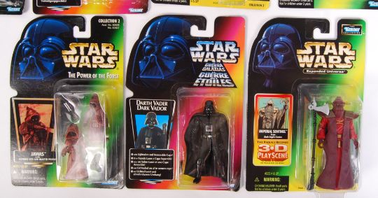 A collection of 15x assorted Kenner carded Star Wars action figures. Various series, to include Power Of The Force and others. All contents factory sealed, mint and unused. To include; Yoda, Bib Fortuna, 4-LOM, Darth Vader, Royal Guard, Malakili and others.