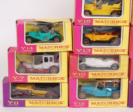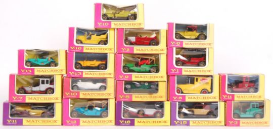 A collection of 18x vintage Matchbox Models Of Yesteryear boxed diecast model cars. All appear mint, within the original yellow & pink display boxes. To include; Y-9, Y-5, Y-10, Y-7, Y-1, Y-2 and others.