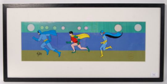 An incredible rare vintage ' The Adventures Of Batman ' Filmation cartoon series animation cel depicting Batman, Robin and Batgirl running along a corridor. Autographed in the corner by Batman co-creator Bob Kane, signed in black ink. Sticker of authenticity present. Has been professionally 'archive' framed with protective glass. Measures; 45cm x 92cm. Incredible display piece.