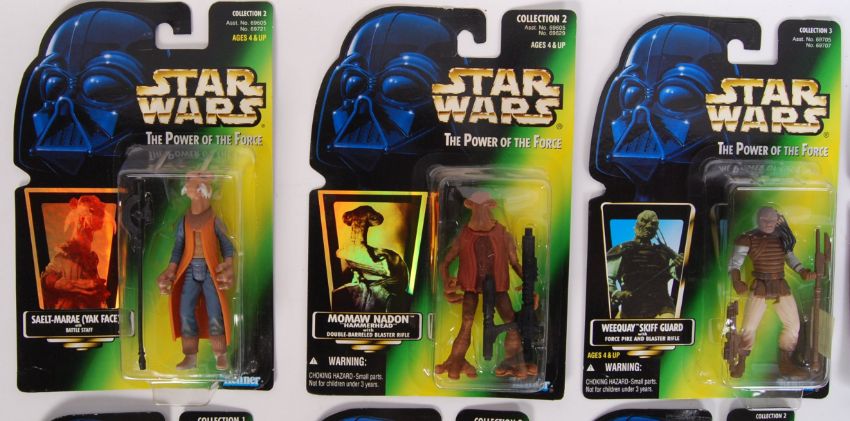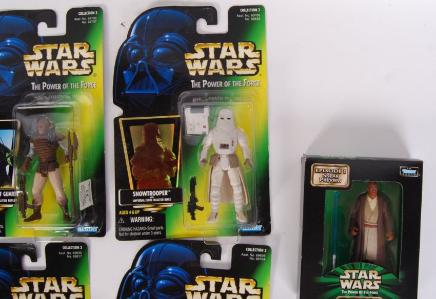 A collection of 10x Star Wars Kenner made ' Power Of The Force ' carded action figures. All appear mint and unused. To include; Mace Windu 'Sneak Preview', Snowtrooper, Death Star Gunner, Luke Skywalker and others. All mint.