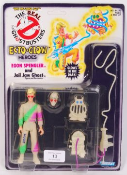 A rare vintage Kenner 1980's ex-shop stock ' The Real Ghostbusters ' ' Ecto Glow Heroes ' carded action figure of ' Egon Spengler & Jail Jaw Ghost .' Unpunched, the figure being mint+ and unopened, on a very near mint (9/10) card back. Rarest figures of the Real Ghostbusters line.