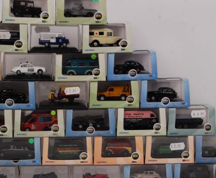 A large collection of 35x assorted small scale (mostly 1:76) Oxford diecast model cars and vehicles. All appear mint, and unused, within the original boxes. Some N gauge scale present. As new.