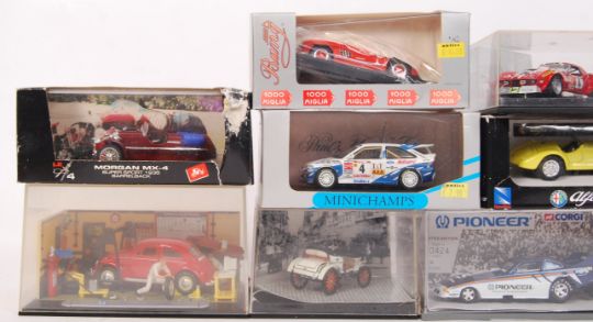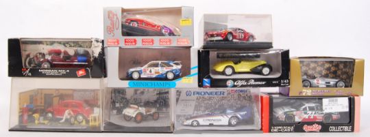 A collection of 10x 1:43 scale various branded precision model diecast cars to include; Bang 1000 Miglia, Vitesse L128, Newray NR519, Quartzo 2044 Chevrolet, Minichamps Ford Escort, Brumm Morgan MX4, Brumm Oro r72, Millenium Collection Opel Lutzman & a diorama model car garage at work. All within their original boxes/ plastic cases.