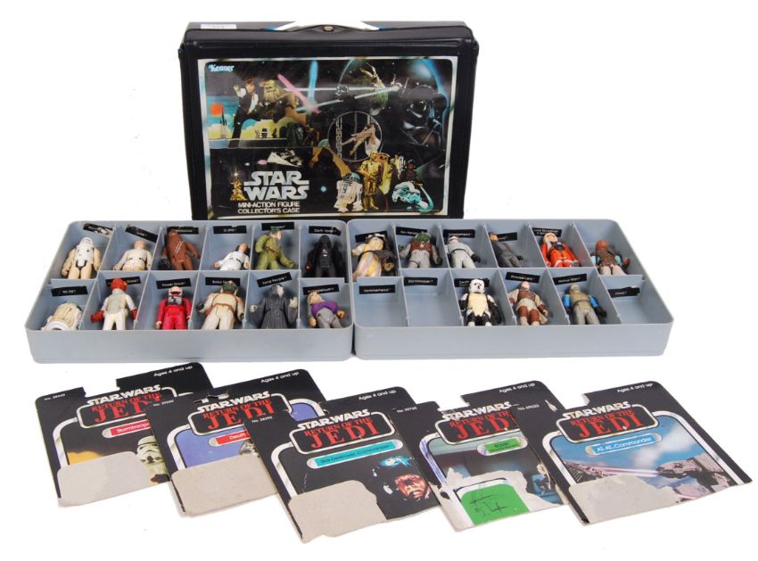 An original vintage Star Wars ' A New Hope ' vinyl ' Mini Action Figure Collector's Case ,' by Kenner. Largely in very good condition. Featuring both inner plastic trays, and 21 original vintage Star Wars action figures, to include; Princess Leia, X Wing Luke, Darth Vader, Chewbacca, R2D2, and others. Some figures with weapons / accessories. Also included are some original cut cardbacks for the action figures.