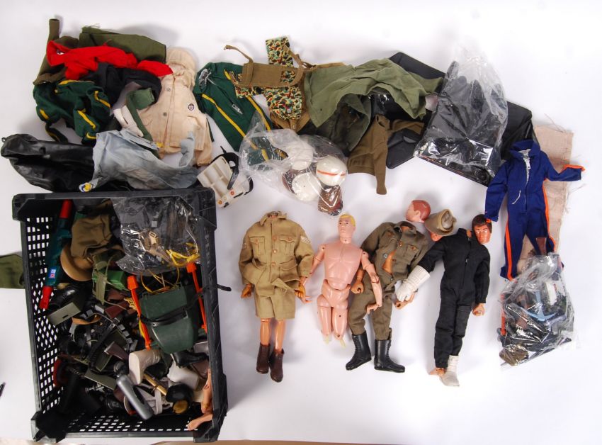 A large and good collection of assorted vintage Palitoy made Action Man figures, weapons and clothing. To include several figures (complete, but heads detached) along with a large amount of assorted clothing, uniforms, guns, belts, boots and other related items. An interesting collection.