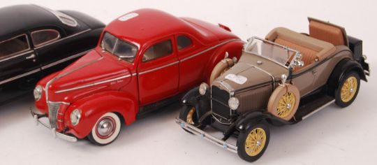 A collection of 5x Danbury Mint precision diecast 1:24 scale model cars. All unboxed and ex-display models. Comprising of: 1931 Ford Model A (one windscreen pillar AF), 1940 Ford Deluxe (paint bubbling), 1949 Jaguar, and 1968 Chevrolet Wl Camino. Although displayed, the cars actually appear complete and very good to near mint condition - buyers are still reminded to satisfy themselves as to condition prior to bidding.