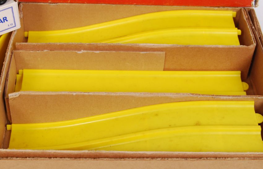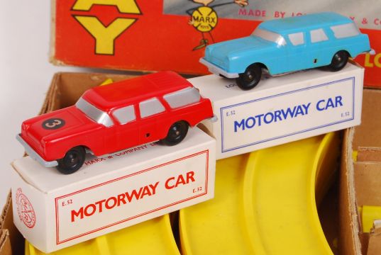 An original vintage Marx Toys ' Motorway ' racing set, with rare variation yellow track. Appears complete with both clockwork plastic cars, and key.