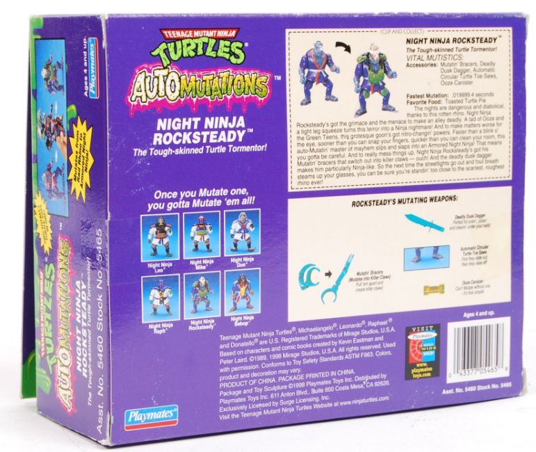 An original vintage 1990's Playmates made Teenage Mutant Ninja Turtles ' Auto Mutations ' series action figure ' Night Ninja Rocksteady .' From an ex-shop stock collection. Mint, factory sealed and unopened.
