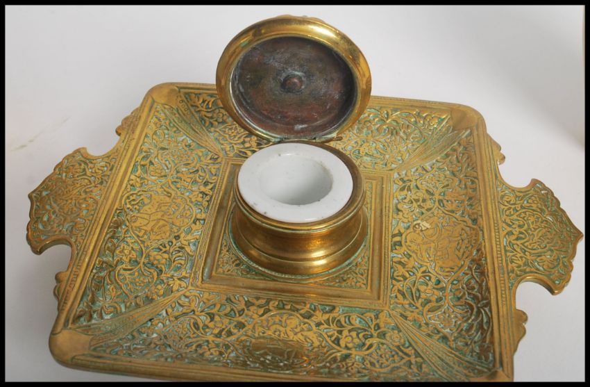 A group of brass items dating from the 19th century to include a pair of vases with bows a pair of Victorian fireside boots and an Indian / Islamic inkwell. Measures 20.5cms highest.