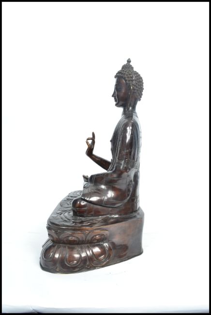 A large bronze statue of a Buddha modelled in the lotus position raised on a pedestal base. Measures 64 cms high.