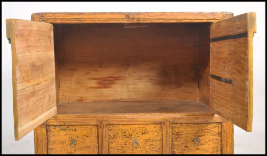 An early 20th century, circa 1910 Antique Chinese hand painted sideboard - cabinet from the Gansu province  being painted with original colours in yellow with further decoration to the doors. Measures 82cms x 125cms x 40cms .