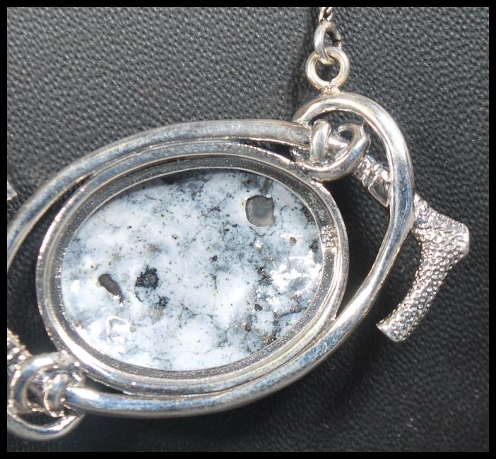 A sterling silver and enamel pictorial necklace of a racing horse with two silver riding crops adjacent set ti a good silver rope twist chain. Weighs 14.4 grams. Pendant measures 4cms wide.