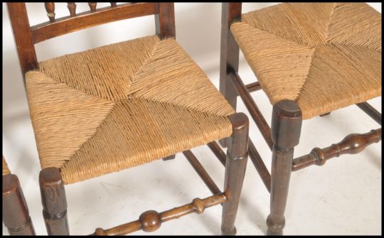 A good set of North Country ladderback country oak dining chairs being raised turned legs with rattan seats having bobbin turned backs, the legs united by stretchers.