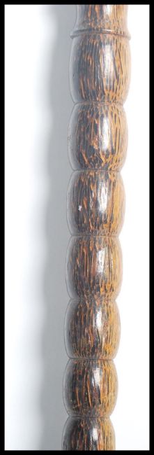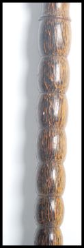 An unusual palm wood walking stick cane having a shaped grip handle having a shaped bulbous shaft. Measures 82 cm long.