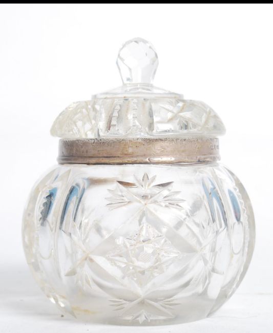A silver hallmarked collared cut glass jam condiment with lid having opening for spoon. Hallmarked for London date letter M makers Henry Hobson & Sons. Measures 14cms high.