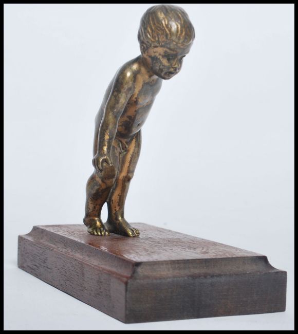 A 20th century gilt finished bronze study of a young child raised on a mahogany plinth base. Measures 12.5cms.