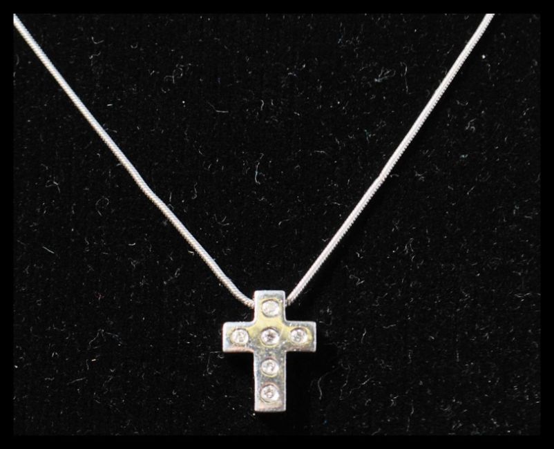 A hallmarked 18ct white gold and diamond pendant necklace strung with a white gold crucifix set with 6 diamonds. Hallmarked Sheffield to chain and crucifix. Measures chain 16 inches, pendant 0.5 inch. Weight 4.1g.