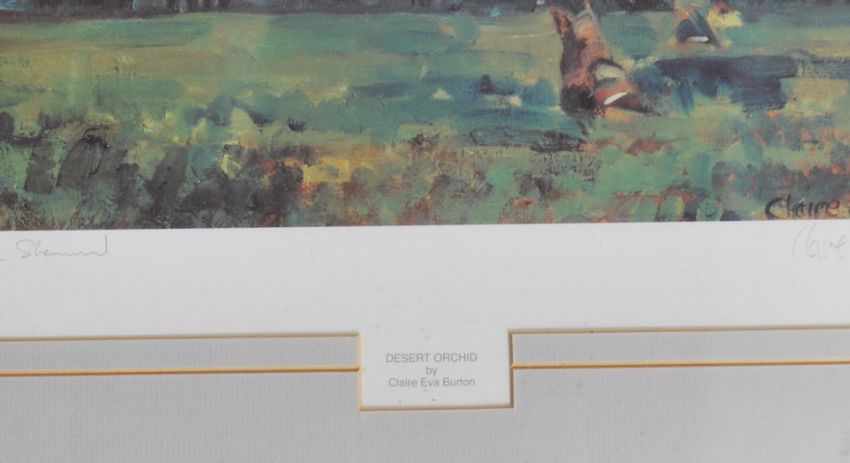Desert Orchid: An contemporary 20th century print of the iconic racehorse signed by artist Claire Eva Burton limited edition 394/500. Framed and glazed.