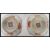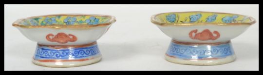 A non matching pair of Chinese famille jaune  table salts raised on pedestal feet, hand printed character marks to base. Measures 3.5 cm high and 7.5 cm wide.
