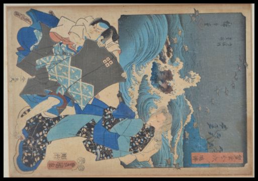 A framed and glazed coloured print of Oriental Japanese warriors being signed by artist.
