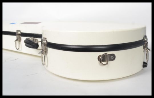 A good quality contemporary Calton white banjo case with red velvet lined sectional interior. Makers label to side. Measures 105 cm long.