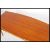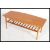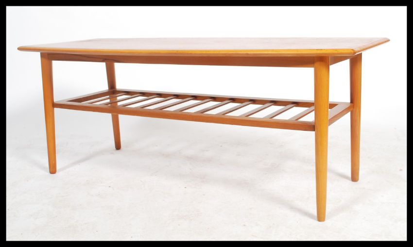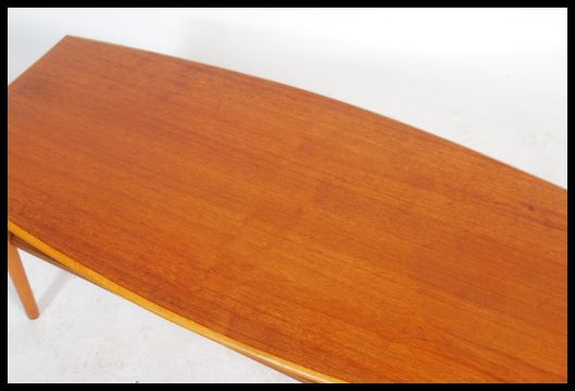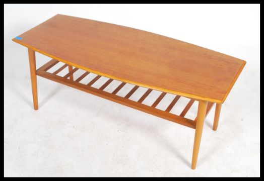 A retro 20th century teak wood surfboard style coffee table being raised on shaped tapering legs united by under tier magazine rack. Measures 47cm x 120cm x 56cm.