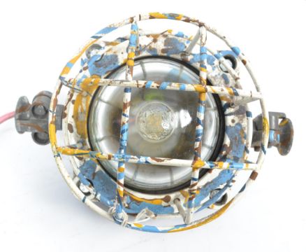 A retro mid century Industrial bulkhead pendant lamp having extreme condition caged outer with glass shade within, metal bracket top